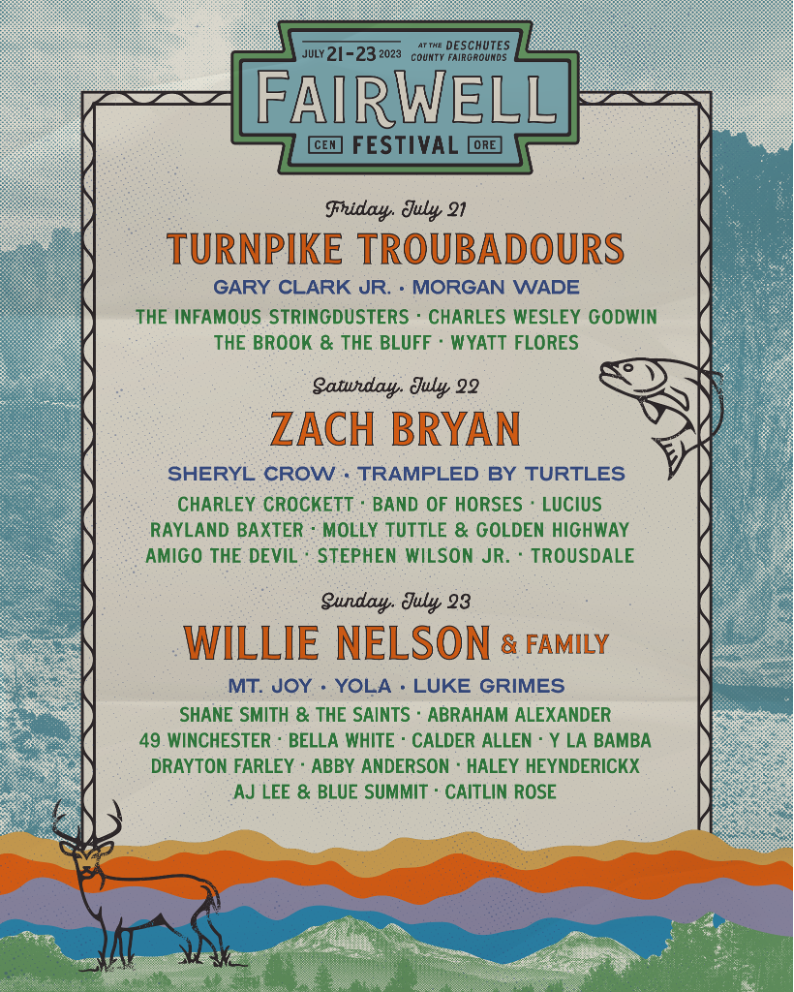 The inaugural Fairwell Festival has been announced to take place from July 21st-23rd, 2023 at the Deschutes County Fairgrounds in Central Oregon. The first ever lineup is set to include headliners Turnpike Troubadours, Zach Bryan, and Willie Nelson & Family. Additional artists on the lineup include Gary Clark Jr., Sheryl Crow, Mt. Joy, Morgan Wade, Trampled By Turtles, Yola, Band of Horses, Luke Grimes and Charley Crockett.